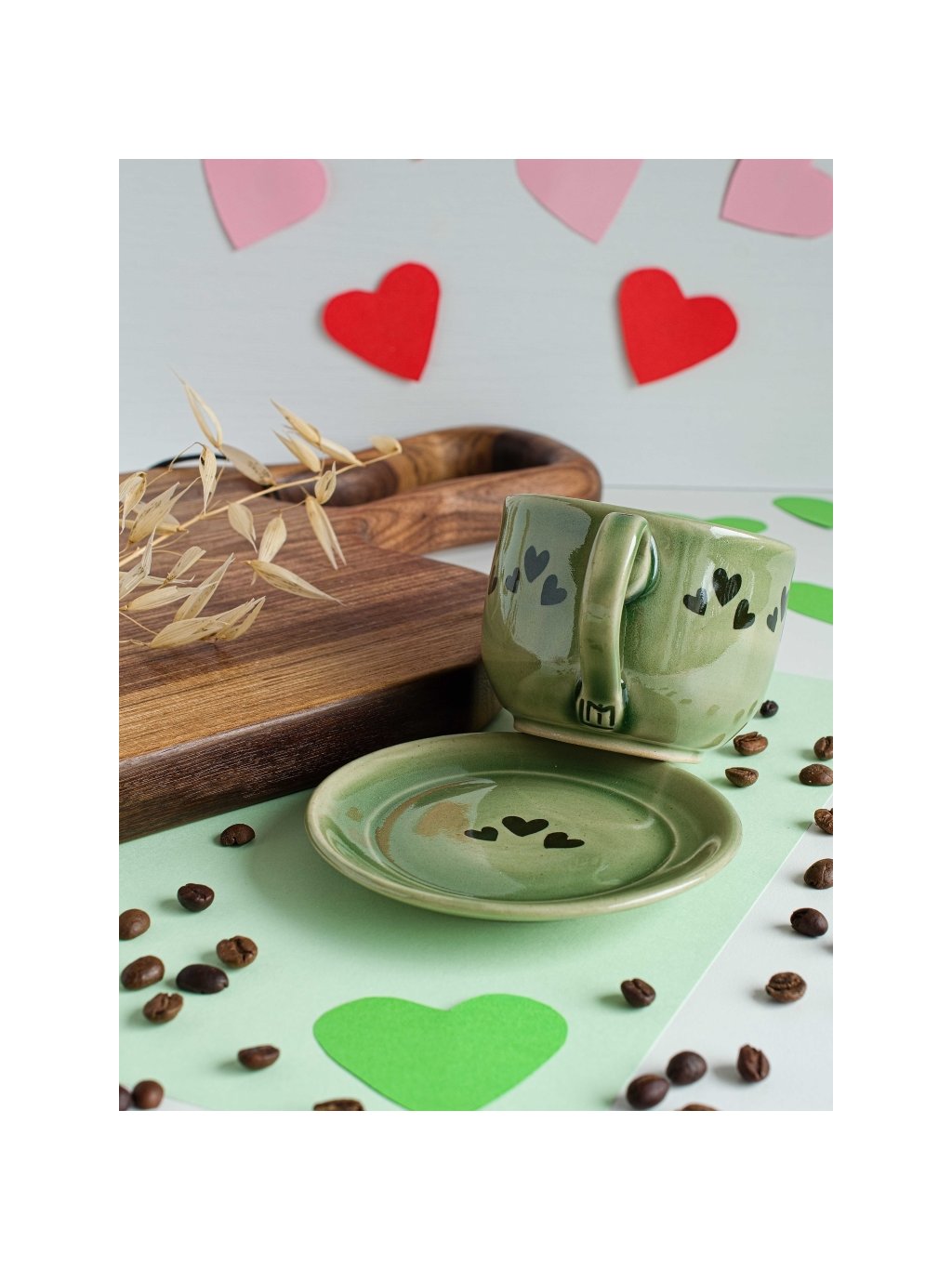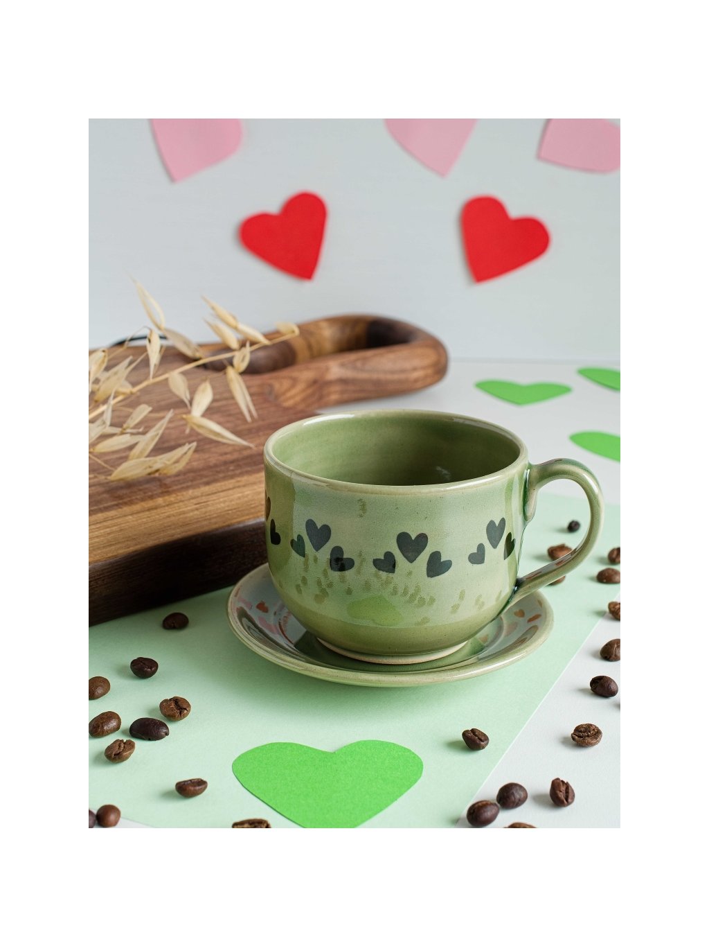 Osvěžující zelený keramický šálek s podšálkem s ručně malovanými srdíčky přináší do Vašich chvil s nápojem energii přírody a hřejivý klid.